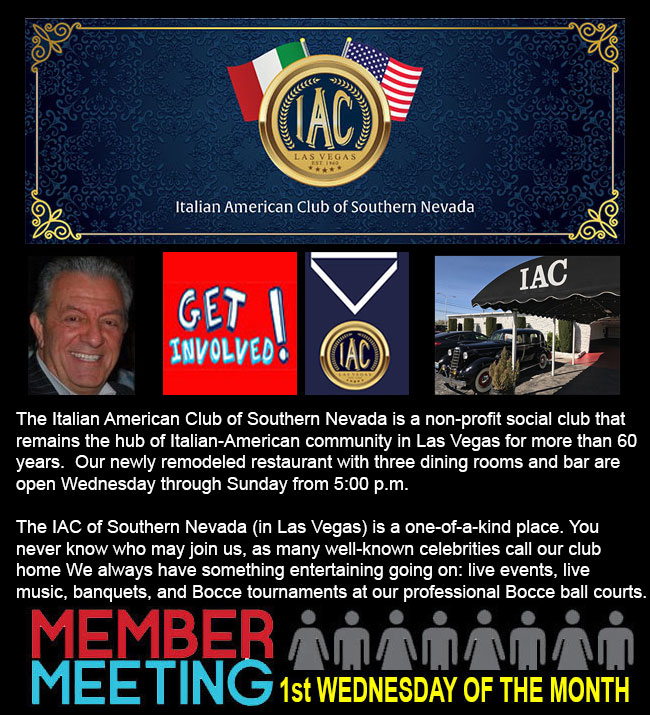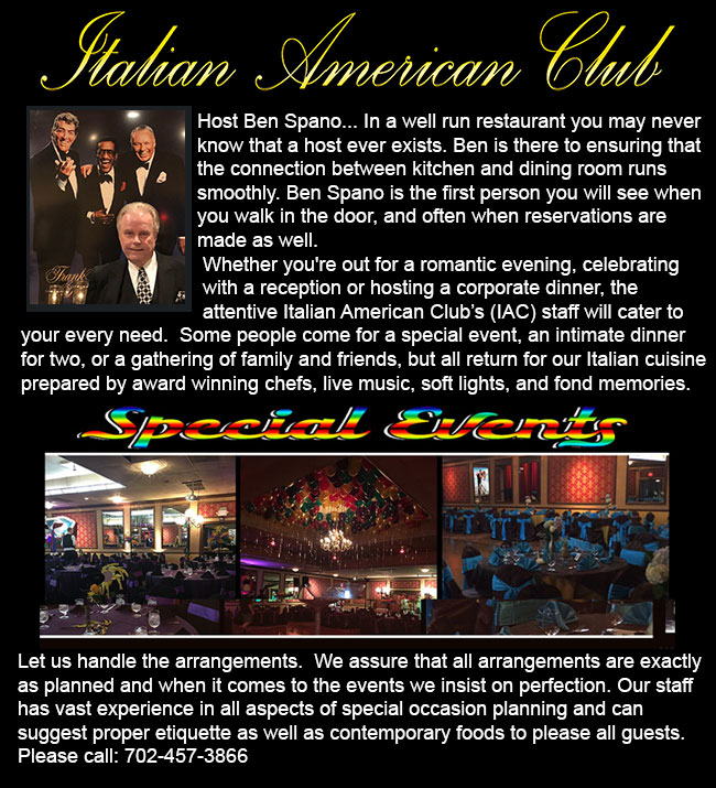 You can get in contact with The Italian American Club of Southern Nevada by calling Janine @ 702-457-3866, from 1:00 pm to 10:00 pm.